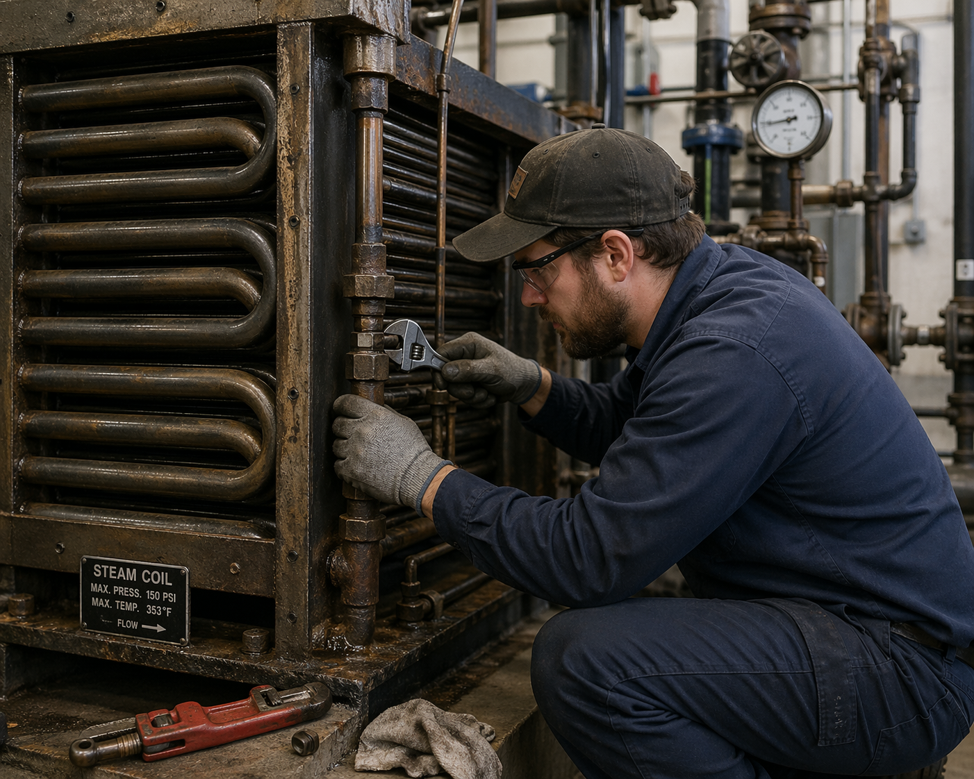 - Air Handling Units (AHUs): Steam coils are typically found in older or industrial buildings' AHUs, where they are used as a primary heating source, or as a preheat source warming cold outdoor air before it hits cooling coils.